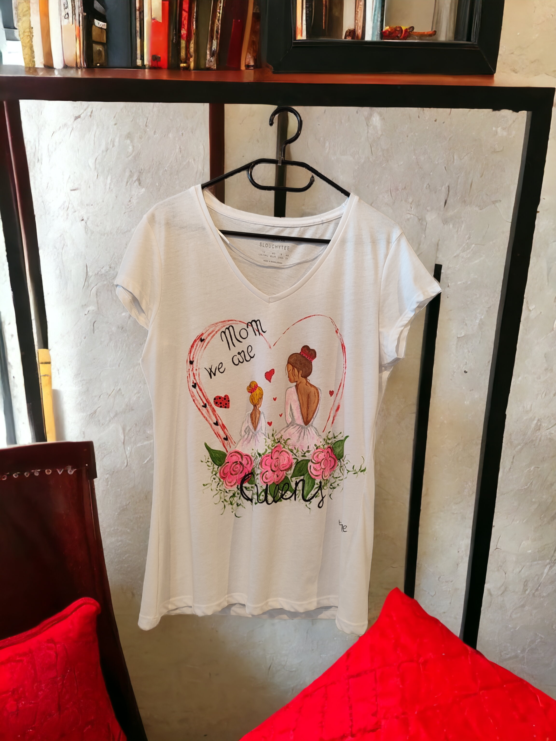 La camiseta MOM es mucho más que una prenda, es un homenaje a esa conexión única entre madres e hijas. Con un diseño original, pintado a mano, esta pieza captura la ternura de una madre en sintonía con su hija. Ambas figuras están representadas con vestidos blancos, delicados y llenos de encanto, sentadas sobre llamativas rosas rojizas que simbolizan amor y cariño. Este diseño no solo destaca por su belleza, sino que también refleja dedicación y calidad artesanal, haciendo que cada camiseta sea única y especial.