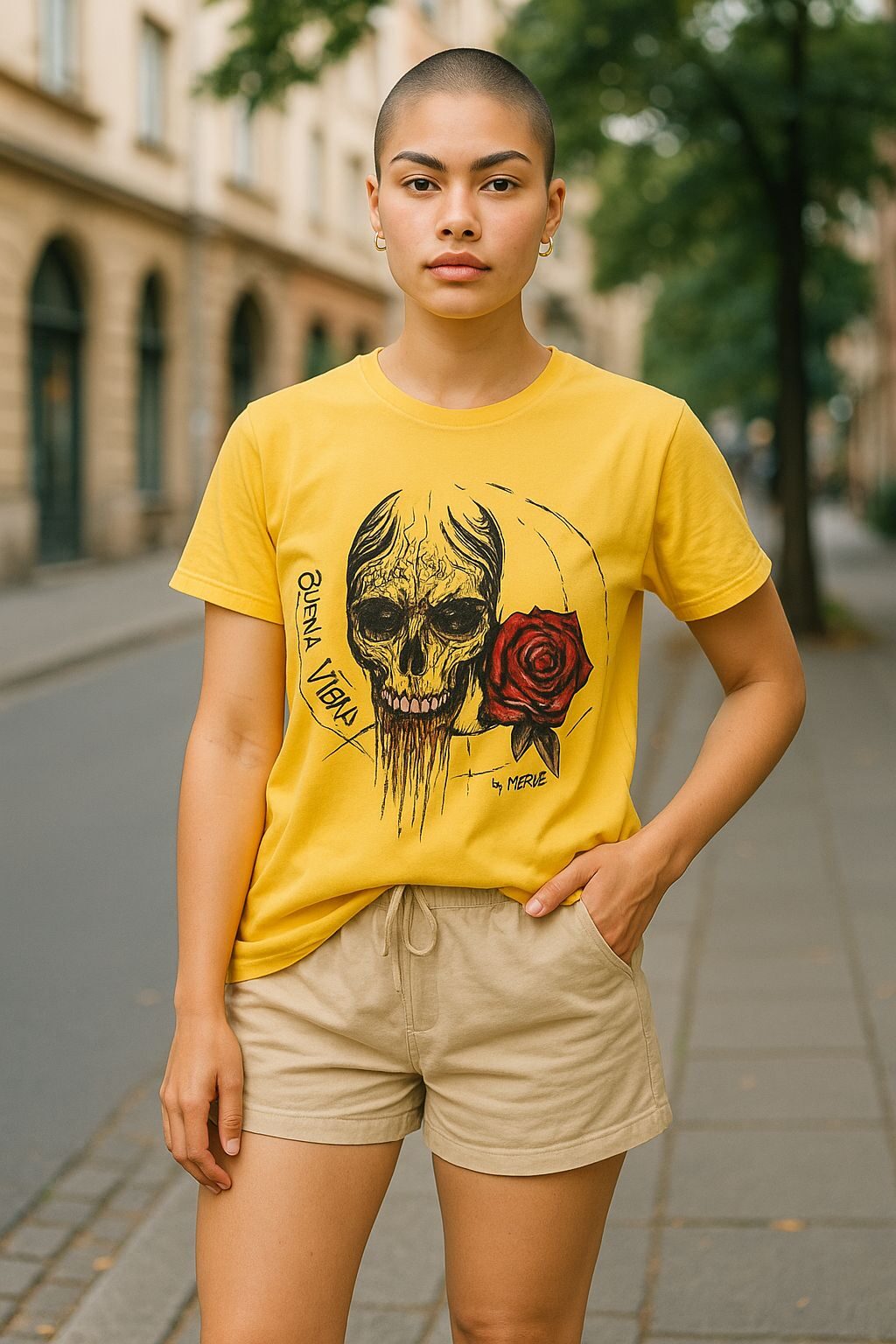¡Descubre la camiseta perfecta para quienes aman expresar su personalidad con estilo! Nuestra camiseta de algodón en color amarillo vibrante está diseñada para destacar. Pero lo que realmente la hace especial es su exclusivo dibujo: una calavera acompañada de una rosa y la frase ‘Buena Vibra’, que transmite energía positiva y un aire bohemio único. Este diseño ha sido creado con una combinación de creatividad y pasión por el arte, ideal para quien busca prendas auténticas y llenas de historia.